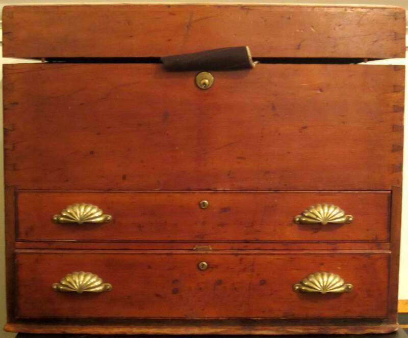 Having a rectangular top above a deep compartment over two drawers with shell shaped brass handles on a molded base, brass handles to either side.