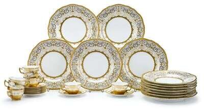 Wide gilt decorated borders, gilt encrusted "gadrooned" serpentine edge; together with eight Wedgwood teacups and saucers, gilt floral vine mid-band with gold encrusted base.