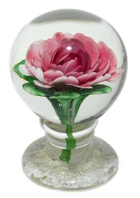 With pale pink to deep pink shaded petals and apple green petals, on a turned pedestal and white speckled foot; unsigned.