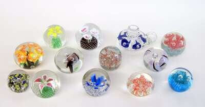 Comprising a Joe St. Clair weight and candle holder; one by Toby McGee; seven unmarked weight; three with impressed "made by me" to underside. (13).