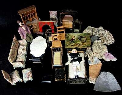 Group of assorted doll furniture, two miniature dolls, and clothes 19th/20th century