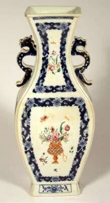 Square baluster form, the body enameled to show urns of flowers with some gilt highlights, within an underglazed blue floral border, twin qilong gilt highlighted handles to neck.