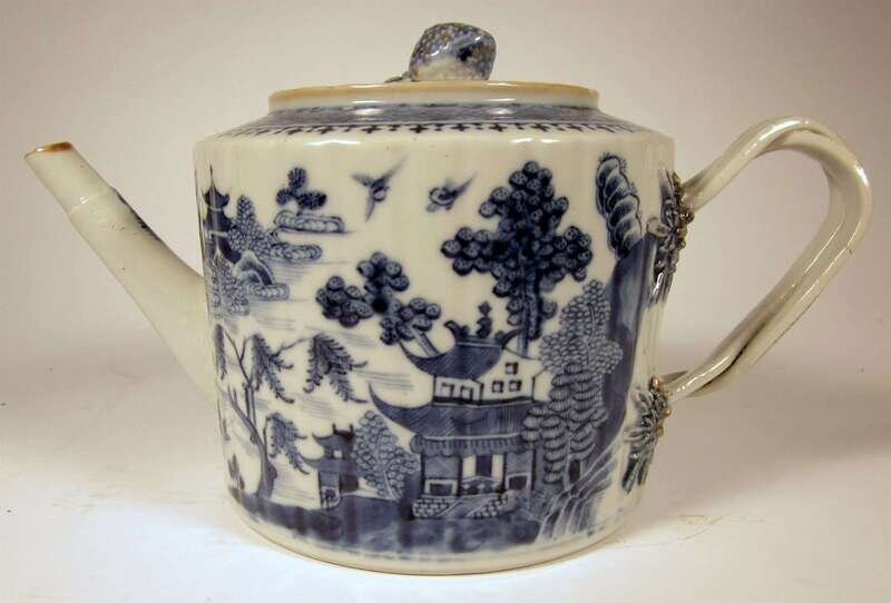The fluted cylindrical pot decorated to show buildings in landscapes, interwining strap handle, the lid with bud finial.
