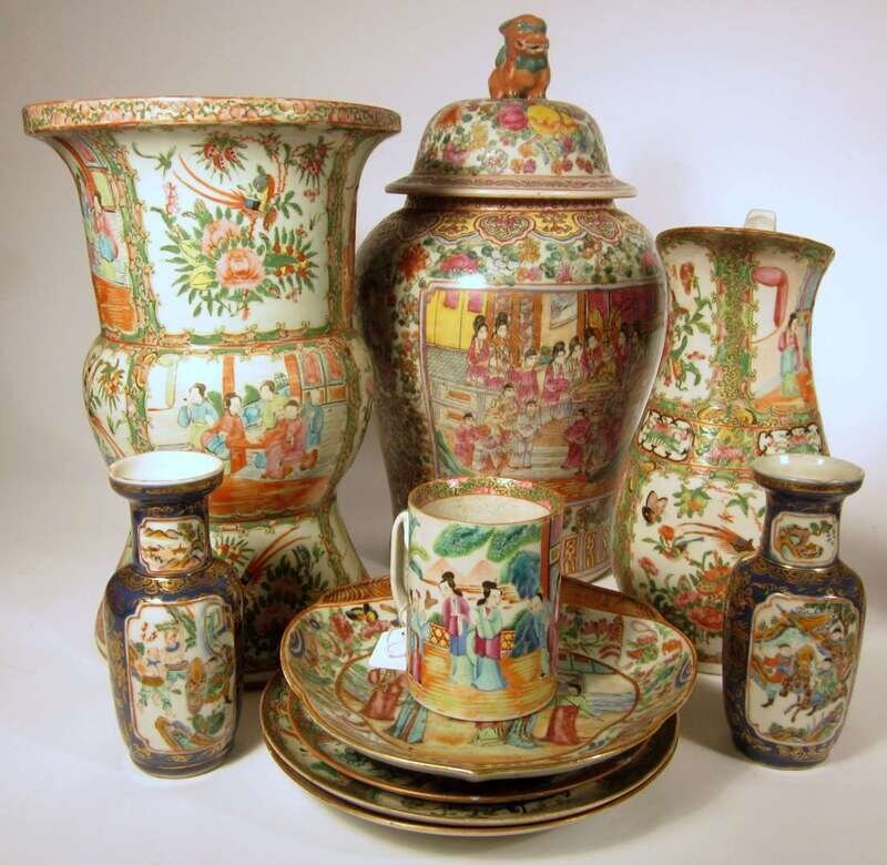 Comprising various forms, including covered vase, Gu form vase, jug and plates.