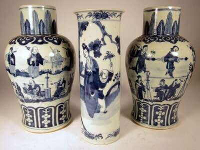 Comprising of a pair of baluster form vases, underglazed to show figures in a landscape, together with a sleeve vase. (3).