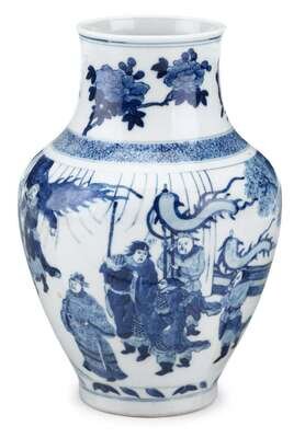 Baluster form underglazed to show figures within a landscape, double blue rings to base.