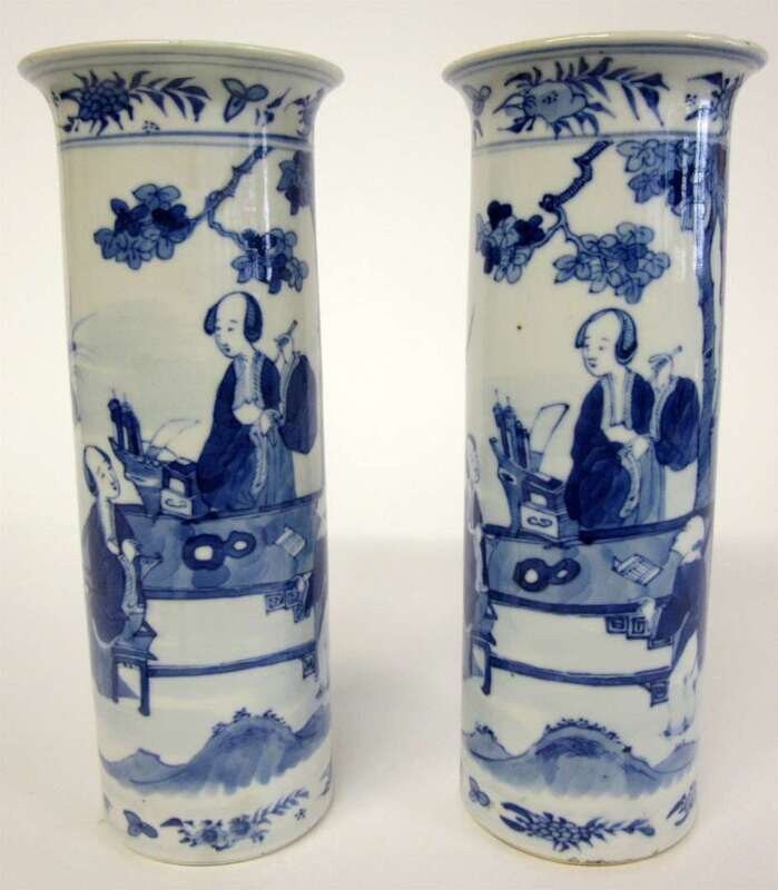 Tall cylindrical forms rising to flared rims, the body decorated with interior scenes of children studying, the neck and base with rock and floral bands.