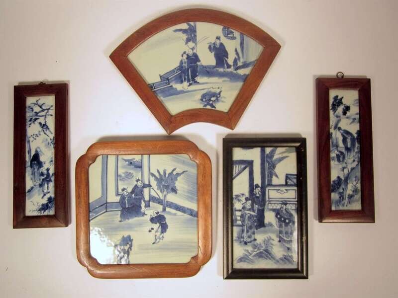Five Chinese blue and white porcelain hardwood mounted plaques mostly 19th century