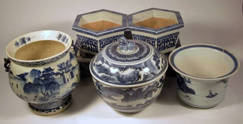 Six Chinese and Japanese blue and white porcelain jardinieres mostly 19th century