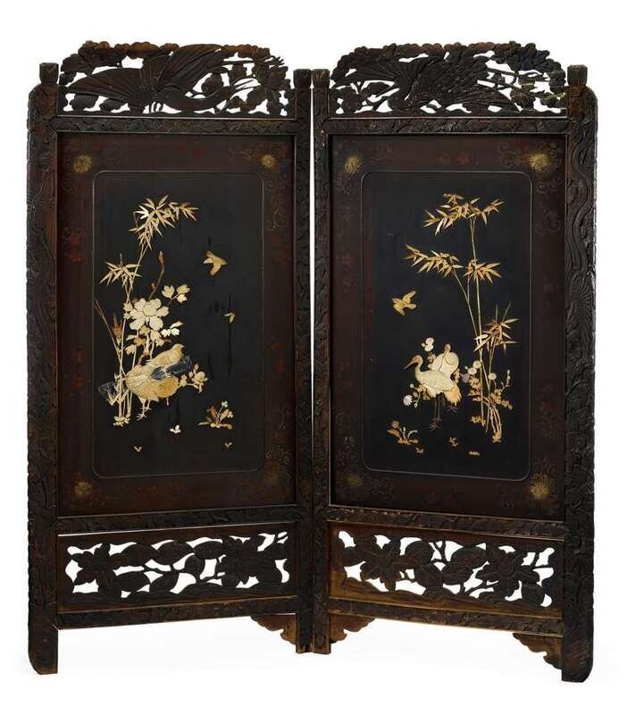 Japanese carved hardwood, mother of pearl, ivory, and hardstone inlaid two panel floor screen late 19th/early 20th century
