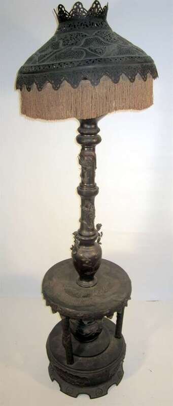 The circular domed and reticulated shade with original silk tassles over a cast standard with applied dragon, raised over a circular table top over three cylindrical supports over a conforming plinth.