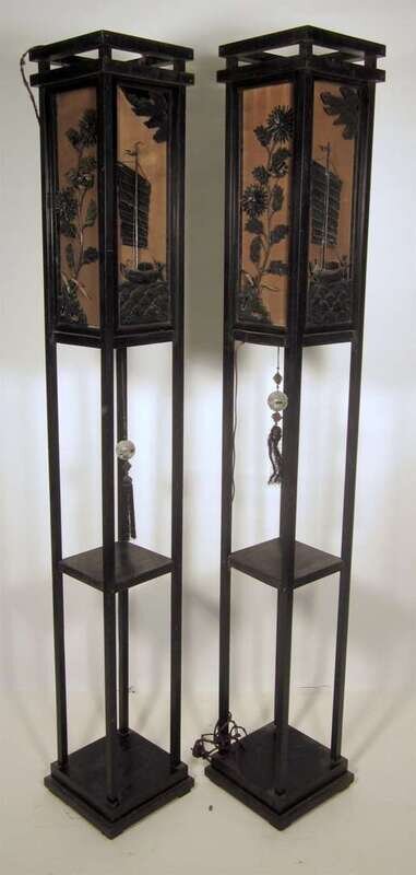 Tall slender square form, with silk shade mounted with metal worked to show floral sprays and sailboats, with painted glass bead light pull. (2).