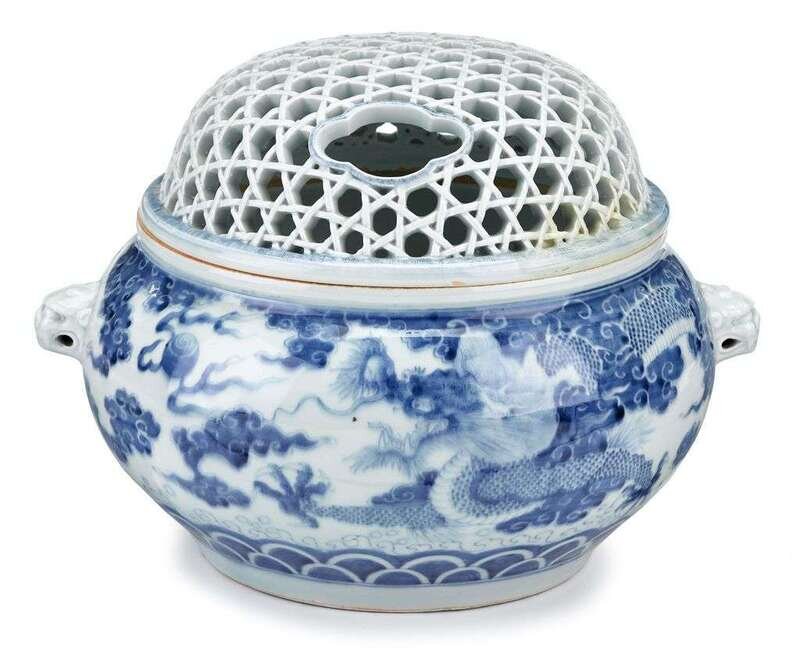 The reticulated cover over wide cylindrical base, set with molded Fu lion mask handles underglazed to show coiled dragon over celestial clouds, raised on circular foot.
