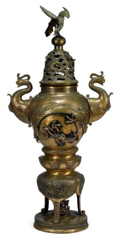 The domed cover openworked to show clouds and dragon, surmounted by a bird, over an ovoid body worked to show dragons, mounted to the shoulder with twin stylised fish form handles, raised on three legs on integral base.