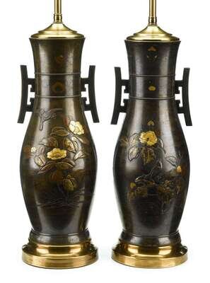 Baluster form, handles mounted to the neck, depicting floral bouquets and birds, raised on a circular plinth base; converted to lamps. (2).