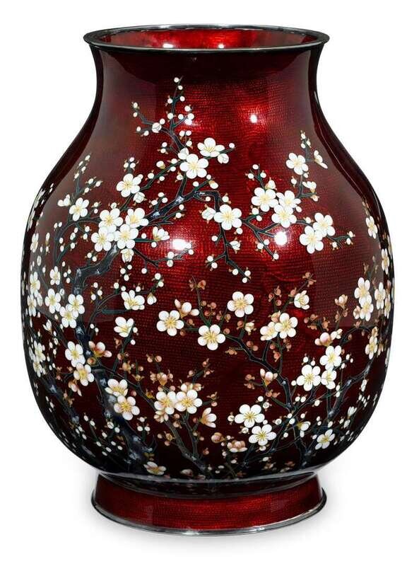 Ovoid form with flared neck, decorated all over to show peony blossoms.