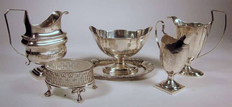Engraved to show scrolls and flowers surrounding a shield, monogram "R.P"; together with a Georgian silver salt with frosted glass liner; a small German silver tray; an American silver creamer, mark for Lower; and a matching Gorham creamer and sugar. (6).