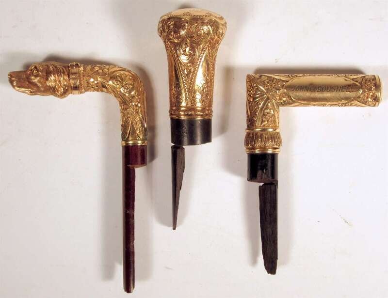 Comprising one finely cast in the form of a dog's head with collar, engraved "C. Haight 1886"; one cast in knob form with foliate scrolls, engraved "Presented to Aliel Heilman by the Boys in the Shop 1882"; and one of cylindrical form with foliate scrolls, engraved " John C. Boushell From Holyoke Friends June 19th 1890".