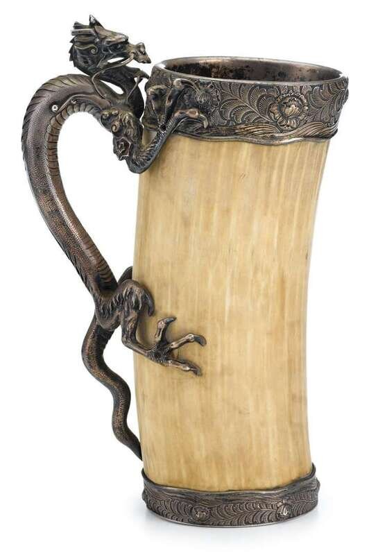 The single-piece tusk section mounted to the rim and foot with foliate cast silver mounts, the mounted silver handle finely cast as a grasping dragon, the underside stamped "Tiffany & co. Sterling silver", engraved "H.V.N. from G.C.C. November 1880" and also "Matilda and Hermann, upon the occasion of their marriage , from H. Victor Newcomb, Nov. 9th 1898".