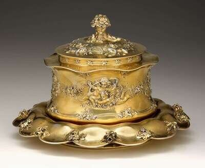 Waisted cylidrical form with wavy flared rim, surmounted by repousse worked detachable lid with floral bouquet finial, the body repousse worked and applied to show playful cherubs and floral swags, over a floral decorated undertray.