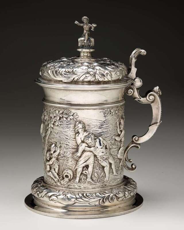 Finely repousse decorated to show bacchic scenes and rococo scrolls, the hinged cover surmounted by a finial in the form of a young boy astride a barrel holding a goblet, C-scroll mask capped handle.