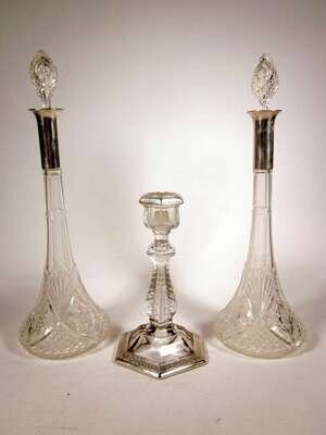 Tapering form, the silver collar on long slender neck above a squat circular body, surmounted by acorn form stopper stamped 800; together with a silver mounted and cut glass candlestick.