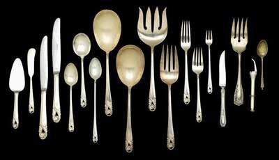 Comprising twenty-five table forks, twenty-three salad forks, two sets of salad servers, twenty-five soup spoons, twelve iced tea spoons, thirty-three teaspoons, eleven pickle forks, twelve butter knives, and twenty four table knives; together with apporoximately ten other small miscellaneous pieces (quantity).