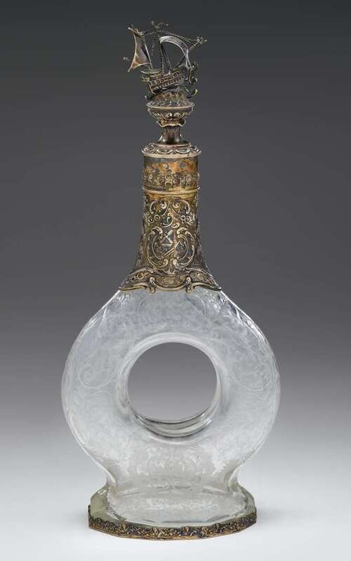 The O-shaped body etched to show birds and scrolls, mounted at the foot and neck in silver cast to show scrolls and a windmill, the stopper with galleon form finial.