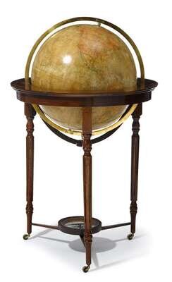 Twelve hand-colored printed paper gores and two polar calottes, inset keys denoting European possessions in the Americas, Asia, and Africa, the passage of famous voyages (Cook, Carterel, Byron etc.) denoted, the title cartouche reading " Globe terrestre d'apres les decouvertes le plus recentes, publie par E.le Bertaux, Rue Serpente, 25. Paris", within brass meridien circle set into a circular stand raised on three fluted legs terminating in castors and united by a stretcher incorporating a compass.