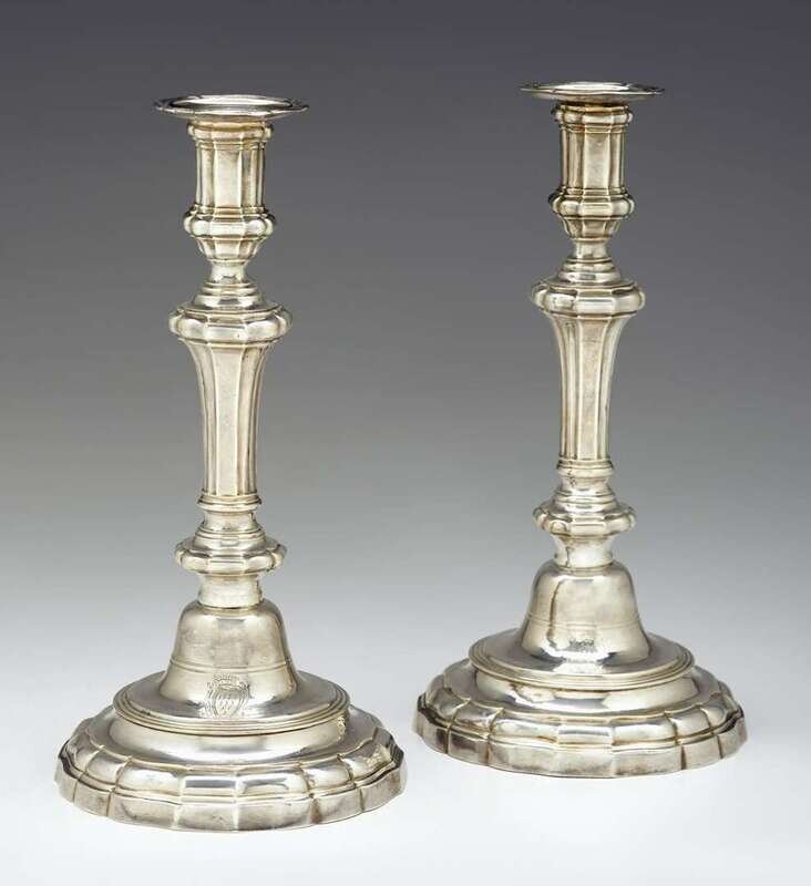 The knopped and fluted stem surmounted by a detachable nozzle, raised on circular base with engraved armorial cartouche. Unidentified (possible pseudo Hanau) marks to undersides.
