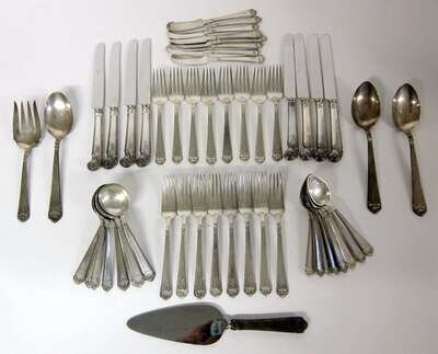 Comprising eight table forks, table knives, salad forks, butter knives, soup spoons and teaspoons, two serving spoons, and salad server.