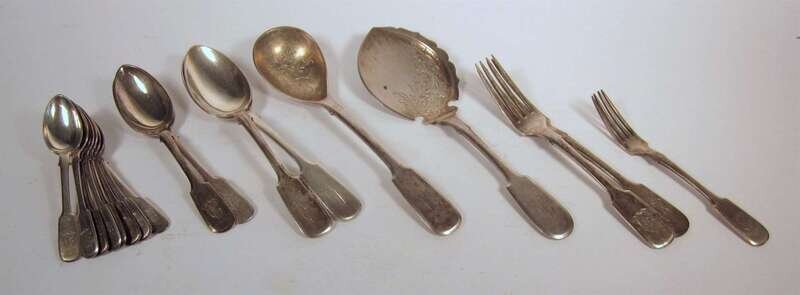 Comprising an engraved fish server, two serving spoons, a berry spoon with engraved bowl, two serving spoons, two tablespoons, two table forks, eight teaspoons, and a salad fork. (17).