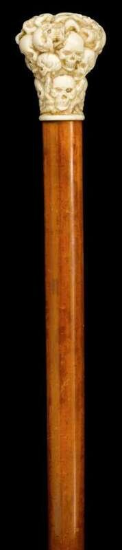 The carved ivory knob modeled as twenty human skulls and scattered bones, mounted on a malacca shaft.