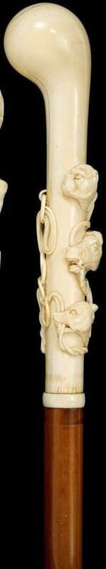 The Ziegenhainer shaped ivory handle intricately carved to show dog and horse heads, on a malacca shaft.