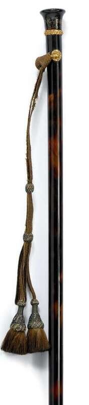 The top decorated with gold pin-heads above a floral engraved yellow-gold collar and matching eyelets, the loop made of a lady's hair, above a slender tapering tortoiseshell shaft.