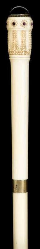 The floral carved knob mounted with large amethyst cabochon to the top, over a tapering ivory shaft.