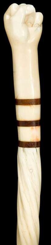 The ivory handle modeled as a left-handed fist, mounted with three mahogany collars, on a narwahl tusk shaft.