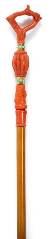 Fine Mediterranean coral, turquoise, and hardwood cane 19th century, italian