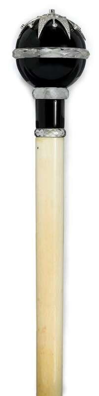 The spherical onyx handle mounted with white gold and small diamonds, on a cylindrical tapering ivory shaft, terminating in a metal cap.