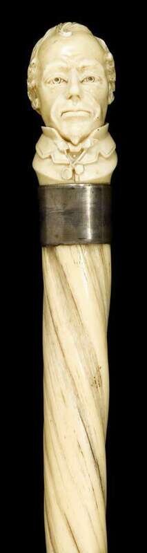 The carved whale ivory handle modeled as the bust of Benjamin Disraeli, mounted on a Narwahl tusk shaft.