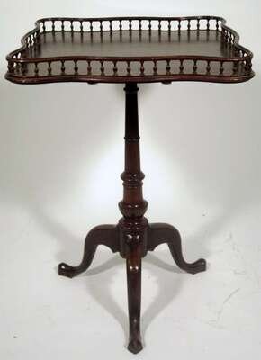 The square serpentine top with galleried edge with baluster spindles, above tapering turned column raised on three outswept legs terminating in pad feet.
