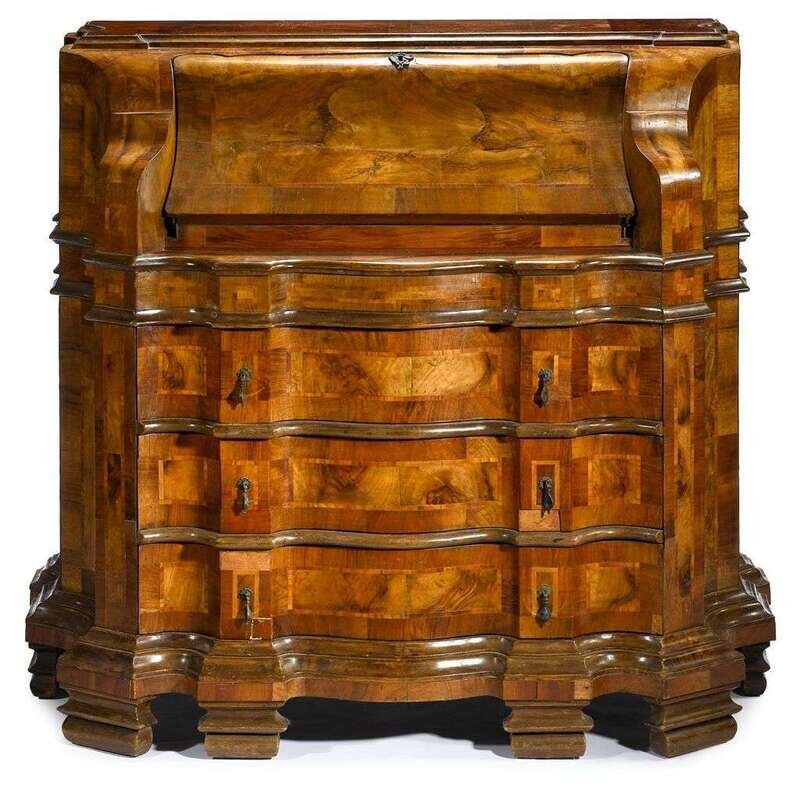 The shaped fall front top opening to a series of pigeon holes and drawers above a writing surface, over a shaped case enclosing three conforming long drawers, raised on eight shaped feet.