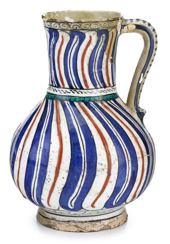 Baluster form, with flared mouth and short foot, underglaze painted to show blue, red and black stripes, with a turquoise band around the shoulder, old inventory labels to underside.