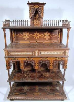The galleried top with supported super structure over open shelf and two short drawers, above an architectural veranda and another shelf, terminiating on flattened bun feet. Inlaid lozenges with arabic script below the frieze.