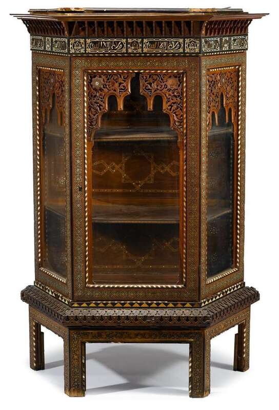 The heavily inlaid cabinet with single glazed door flanked by two similar side panels, surmounted by carved frieze showing Arabic script, the whole raised on square legs.