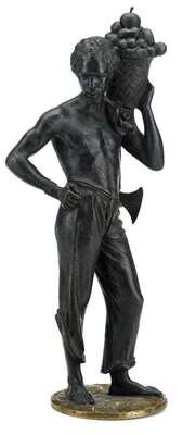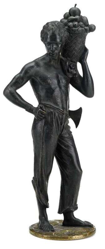 The figure with a basket of fruit on his shoulder and an axe in his belt, raised on a circular gilt bronze base.