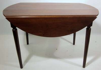 The round plank top with drop down D-shape sides over four cylindrical tapering legs.
