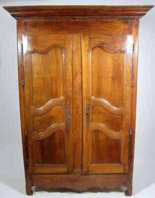 The ogee molded cornice over two iron-mounted panelled doors, above a carved apron and stile feet.