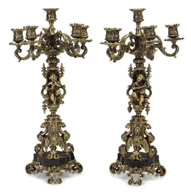 The standards cast as seated putti playing music surmounted by S-scrolls, issuing five scrolling candlearms and a central nozzle, raised on three gargoyle form feet, the whole raised on a conforming black marble and gilt bronze base.