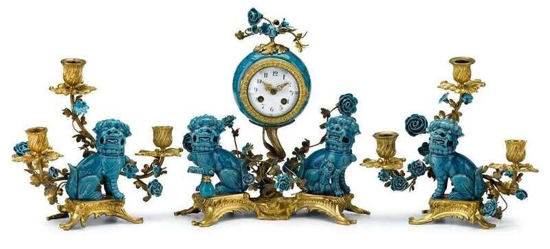 The circular dial with Arabic numerals within a turquoise-glazed ceramic case, raised on a vine-form support, flanked by outwardly facing fu lions and floral sprays, over a rococo gilt bronze base; the candelabra composed of a single fu-lion, issuing three candlearms, raised on similar bases. (3).